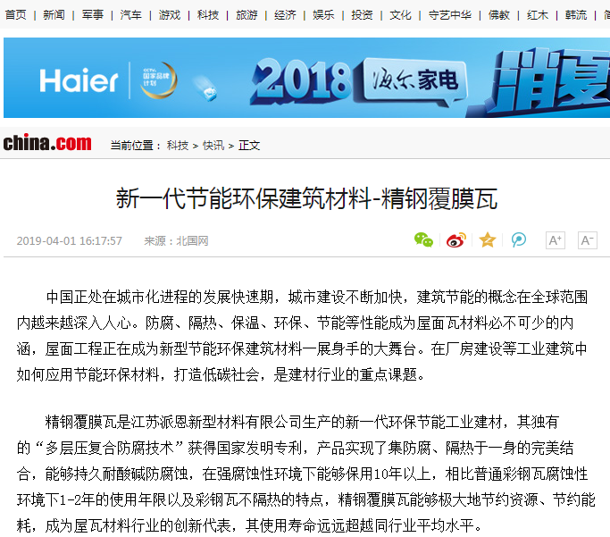 近日,中華網、鳳凰網、新浪網等數十家媒體就派恩公司自主研發生產的新一代節能環保建筑材料——精鋼覆膜瓦產品予以廣泛報道,引發社會強烈反響。 精鋼覆膜瓦是江蘇派恩新型材料有限公司旗下產品,是一種新型覆膜金屬瓦,是新一代廠房屋面、墻體建筑材料,是彩鋼瓦的升級換代產品,具有突出的防腐和隔熱2大功能,腐蝕性環境下保用10年以上!