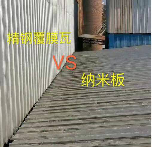 精鋼覆膜瓦是以0.5mm高強度的特種鋼板為基板,正反兩面復合防腐隔熱材料,及防腐和隔熱與一身的防腐蝕廠房屋面瓦,適合用于大跨度的廠房屋面和墻體。但是市面上還有一種覆膜瓦,是在金屬基板上覆膜的一種復合金屬板,統稱納米板。這兩種覆膜板從外表上看沒有多大的區別,但使用一段時間后,區別很明顯,下圖為例:
