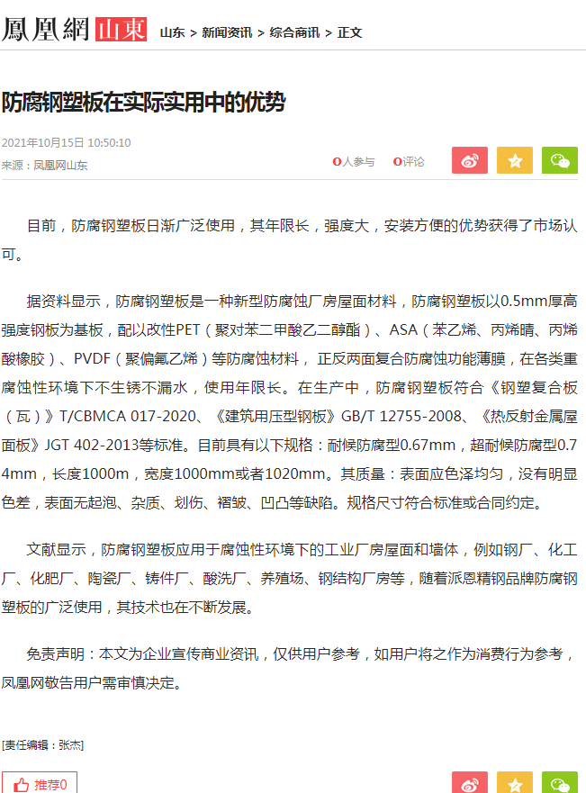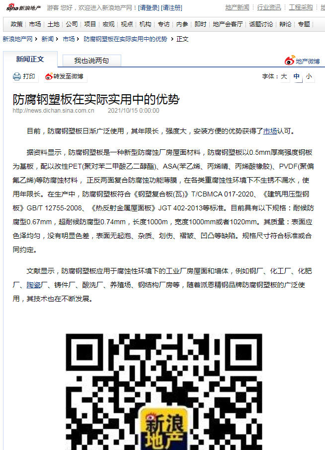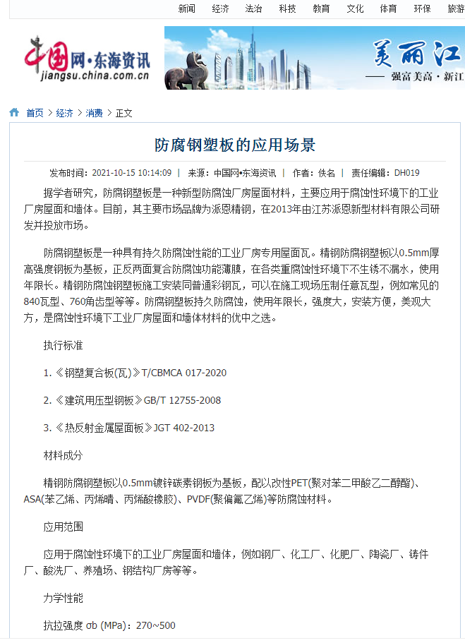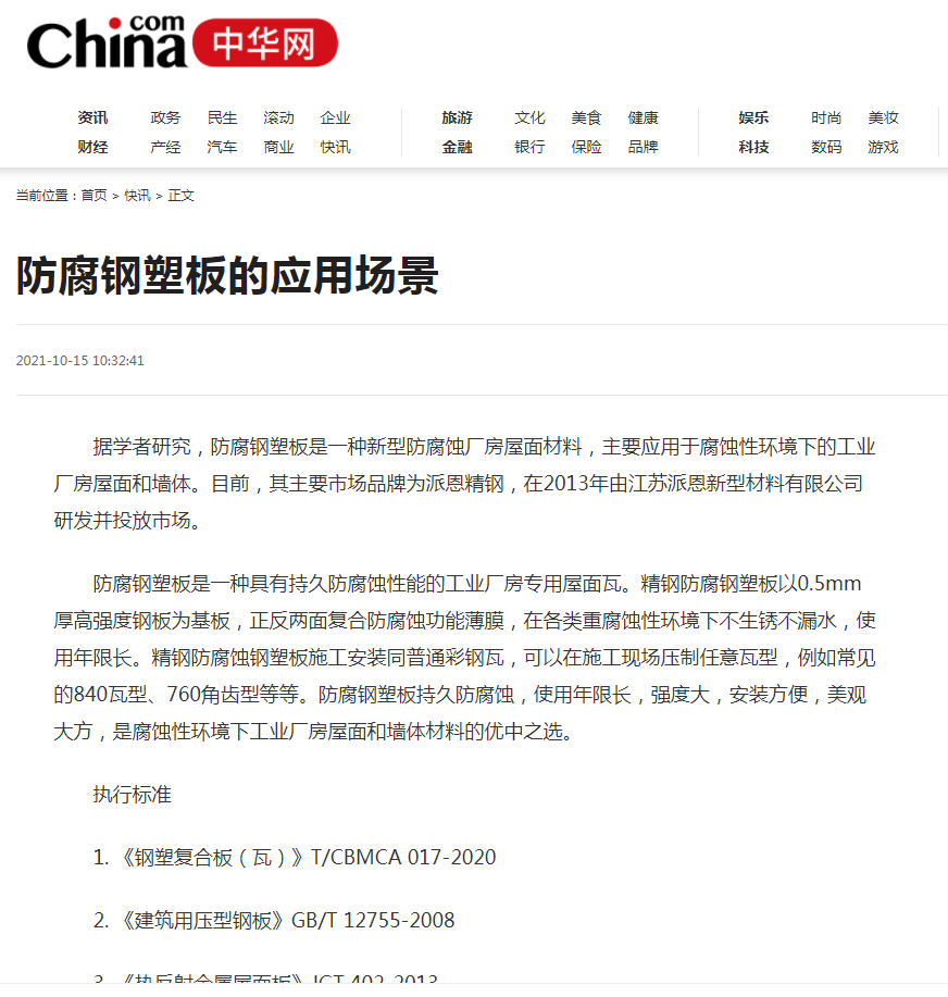 近日,《精鋼防腐鋼塑板在實際應用中的優勢》和《精鋼防腐鋼塑板的應用場景》這2篇文章在中華網、中國網·東海資訊、新浪、鳳凰網等多家媒體爭相報道。